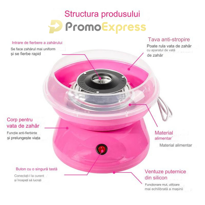Masina de facut vata de zahar este usor de utilizat, trebuie doar sa adaugati zaharul preferat si in cateva minute vata de zahar pufoasa este gata.